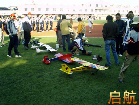 啟航網訊 10月23日上午8時45分,隨著解說員的倒計時口令,由劉高航院長親自點火發射的一枚神舟號火箭模型直沖云霄,并順利開傘著陸。運動會航模表演正式拉開了帷幕。隨后上場的是由華黎閩同學操縱的一架“新宇號”遙控特技飛機,該飛機表演了筋斗,橫滾,低空通場,倒飛等特技項目,期間還配合地面火箭完成了地空火箭模擬發射。然后,由原國家隊隊員徐韜鈞同學表演線操縱模型項目,該飛機表演了連續正筋斗3個,倒飛,過頂,負筋斗,8字等高難度動作。接著,由航模協會顧問楊劍同志表演3D花式飛行,飛機以很低的速度完成了大迎角飛行,尾沖,螺旋,懸停等動作。再來是由去年參加省運會P5B-2項目的華黎閩同學表演電動滑翔機項目,該飛機完全采用電作為飛機的動力,充分體現了飛機未來發展的環保趨勢。最后上場的是洪都集團的陳團結同志表演的直升機項目,并表演了懸停,原地360度轉向等高難度動作,隨后順利著陸。至此航模表演順利結束。