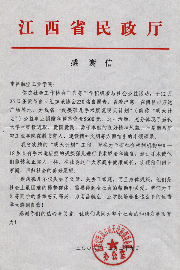 你院社會工作協(xié)會王巖等同學(xué)積極參與社會公益活動,于12月25日圣誕節(jié)當(dāng)日組織該協(xié)會230名志愿者,冒著嚴(yán)寒,在南昌市萬達(dá)廣場等地,為我省“殘疾孤兒手術(shù)康復(fù)明天計劃”(簡稱“明天計劃”)公益事業(yè)捐贈和募集資金5600元。這一活動,充分體現(xiàn)了當(dāng)代大學(xué)生積極進(jìn)取、愛國愛民、勇于奉獻(xiàn)的良好精神風(fēng)貌,也是南昌航空工業(yè)學(xué)院在教書育人、建設(shè)精神文明等方面結(jié)出的豐碩碩果。