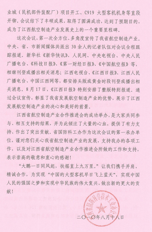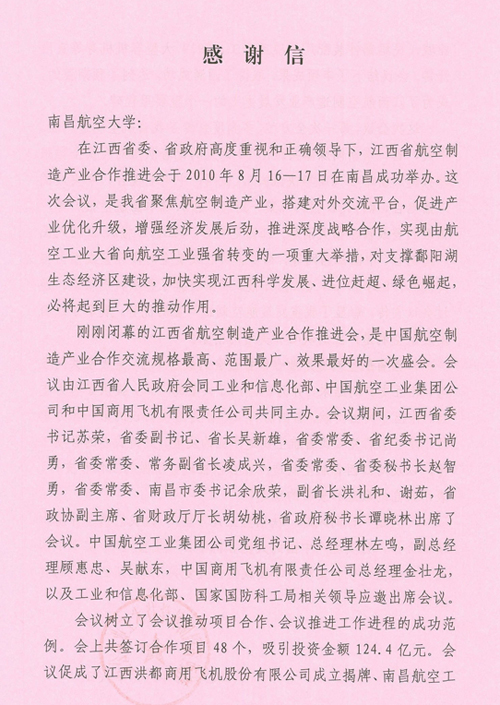 啟航網訊 近日,省國防科工辦給我校發來感謝信,感謝我校對江西省航空制造產業合作推進會會務工作的支持。