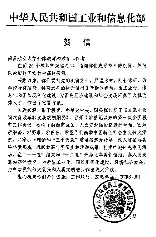 工業和信息化部給全校教師發來賀信祝賀教師節
