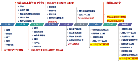 材料科學與工程學院的前身可追溯到1952年建校初設立的“熱處理科”、“表面處理科”、“焊工科”、“鑄工科”和“鍛工科”。1978年設立熱加工系,后更名為材料工程系。1998年成立材料科學與工程系,“腐蝕與防護”從化學工程系調整到材料科學與工程系,并與“金屬材料及熱處理”專業合并成立了“金屬材料工程”專業;以“鑄造成型工藝及設備”、“塑性成型工藝及設備”和“焊接工藝及設備”專業為基礎成立了“材料成型及控制工程”專業。2004年正式建立材料科學與工程學院。2009年,學校為進一步強化航空特色,將材料成型及控制工程、焊接技術與工程兩個專業分流組建航空制造工程學院,在金屬材料工程、高分子材料與工程專業基礎上重組材料科學與工程學院。2024年,為加強材料學科建設,學校將航空制造工程學院的材料熱加工類專業與原材料科學與工程學院專業合并成立新的材料科學與工程學院。