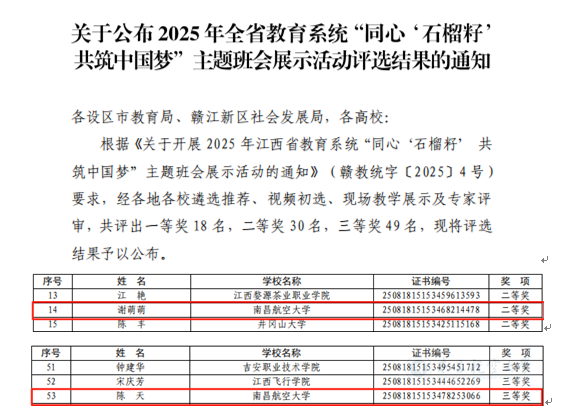 啟航網(wǎng)訊 近日,由江西省教育廳主辦、江西省高校鑄牢中華民族共同體意識(shí)研究中心和南昌大學(xué)共同承辦的2025年全省教育系統(tǒng)“同心‘石榴籽’共筑中國(guó)夢(mèng)”主題班會(huì)展示活動(dòng)公布獲獎(jiǎng)名單。我校土木與交通學(xué)院輔導(dǎo)員謝萌萌、材料科學(xué)與工程學(xué)院輔導(dǎo)員陳天分別榮獲二等獎(jiǎng)、三等獎(jiǎng)。