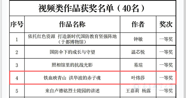 啟航網訊 日前,江西省2025年“愛我國防”主題作品征集活動評選結果揭曉。我校馬克思主義學院葉煒莎同學的視頻作品《鐵血映青山 洪華波的赤子魂》獲一等獎,外國語學院唐鋅同學的圖文作品《腳印作界碑 青春護山河》獲二等獎。