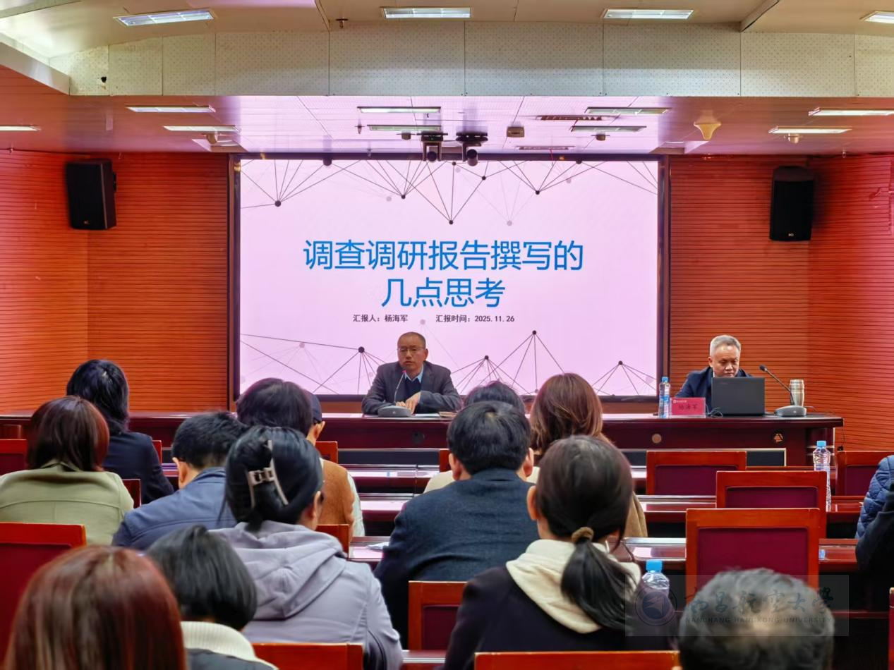 此次培訓特邀民建南昌航空大學委員會副主委、民建江西省委會經濟委員會常務副主任、省政協委員楊海軍擔任主講嘉賓,他以“調研報告撰寫的幾點思考”為主題,闡述了研究報告的基本概念和功能,指出其作為決策依據的重要性;解析了如何撰寫高質量的研究報告,包括選題精準、數據收集、結構邏輯和語言表達等關鍵技巧;分享了個人體會,強調實事求是、問題導向和持續學習在調研工作中的核心價值。通過生動案例和互動環節,楊海軍將理論與實踐緊密結合,參會代表紛紛表示收獲頗豐,對提升自身參政議政能力具有直接指導意義。