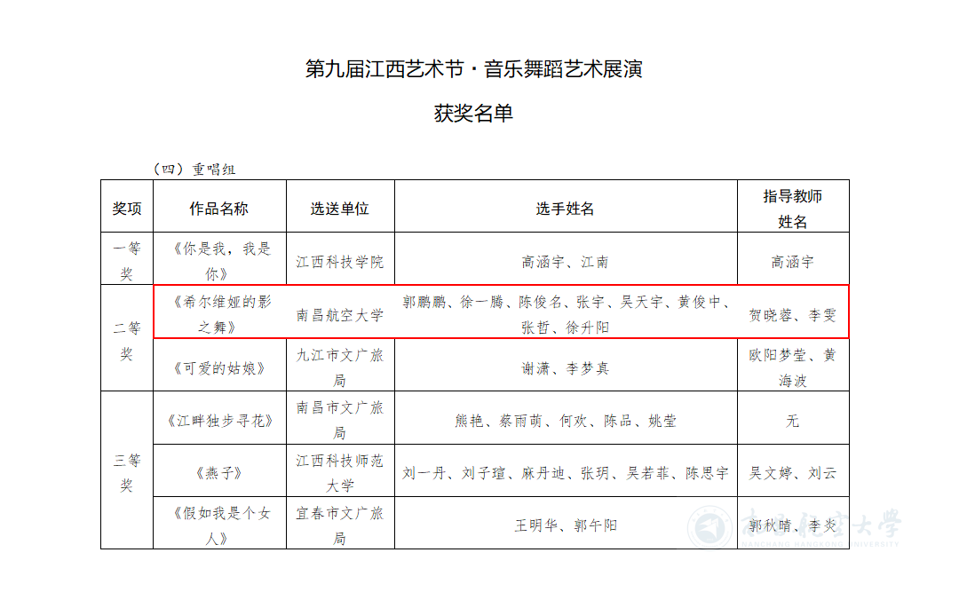 啟航網(wǎng)訊 近日,我校航空服務(wù)與音樂學(xué)院師生在中共江西省委宣傳部、江西省文化和旅游廳主辦的第九屆江西藝術(shù)節(jié)·音樂舞蹈藝術(shù)展演中喜獲佳績。由學(xué)院賀曉蓉副教授、李雯老師指導(dǎo)的節(jié)目《希爾維亞的影之舞》斬獲聲樂展演重唱組全省第二名(二等獎)的優(yōu)異成績!
