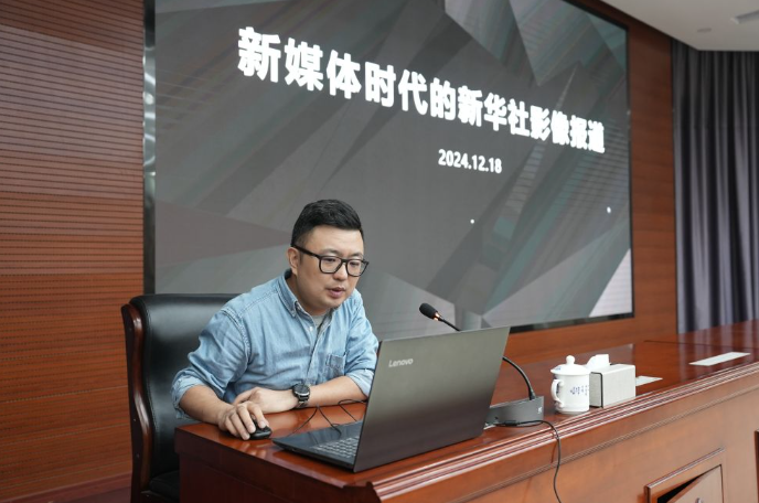 新華社江西分社攝影采訪部主任、記者周密以《新媒體時代的新華社影像報道》為主題進行了現場分享。周密結合他豐富的新聞從業經歷,講述了一張張新聞照片和一條條視頻背后的故事,并聯系案例分享了影像作品的新聞價值挖掘和構思技巧等,幫助學子們在提升新聞素養能力的同時,感受新聞的力量。