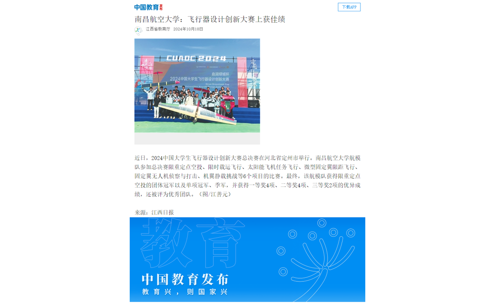 您的位置: 首頁 >新聞中心>媒體南航>詳細內(nèi)容 媒體南航 《中國教育發(fā)布》:南昌航空大學:飛行器設計創(chuàng)新大賽上獲佳績 來源: 作者: 攝影: 發(fā)布時間:2024-10-18 瀏覽次數(shù): 次 【字體:小 大】 啟航網(wǎng)訊:10月18日,《中國教育發(fā)布》報道我校:南昌航空大學:飛行器設計創(chuàng)新大賽上獲佳績媒體鏈接:http://fx.xwapp.moe.gov.cn/article/202410/6711d1c45eb9ce3753e33460.html 責任編輯:李夢遙 【打印正文】