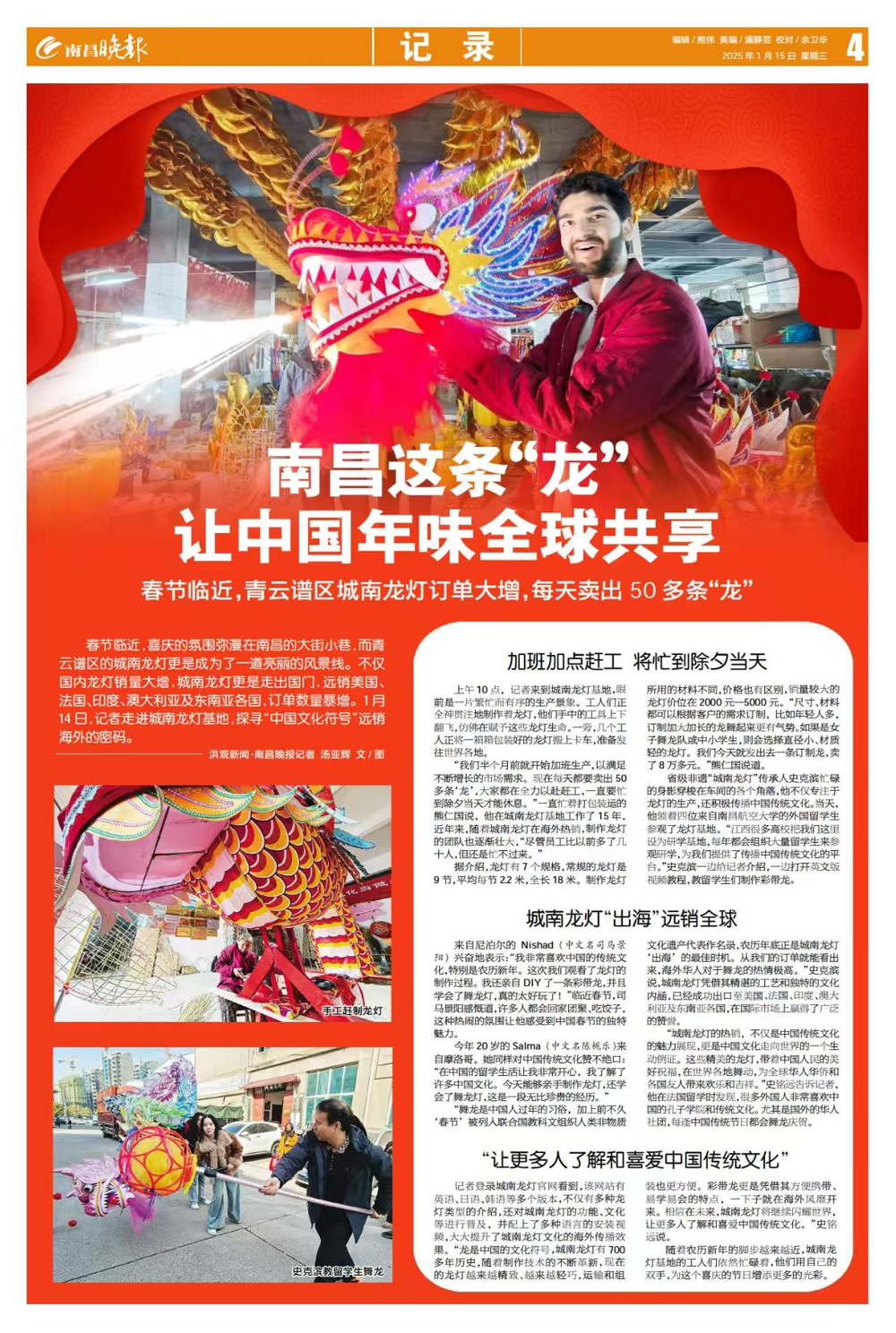 啟航網訊:四位來自南昌航空大學的外國留學生參觀了青云譜區的城南龍燈基地,探尋“中國文化符號”遠銷海外的密碼,感受中國春節的獨特魅力。南昌日報、南昌晚報對此進行報道。