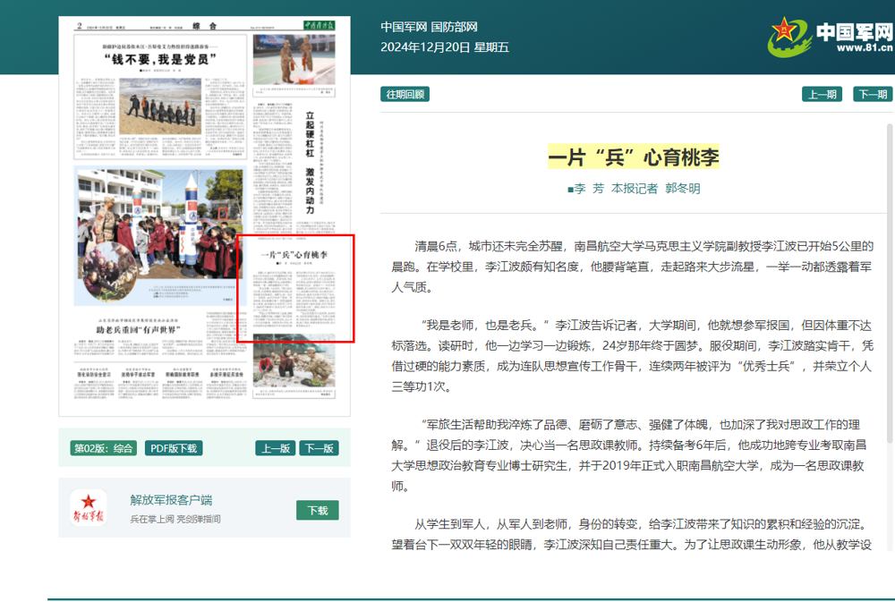 啟航網訊:近日,中國軍網-中國國防報以“一片‘兵’心育桃李”為題報道了我校教師李江波。