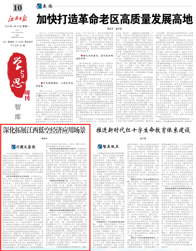 啟航網(wǎng)訊:3月24日,我校黨委書記李德平在《江西日報(bào)》10版發(fā)表題為《深化拓展江西低空經(jīng)濟(jì)應(yīng)用場景》的署名文章。
