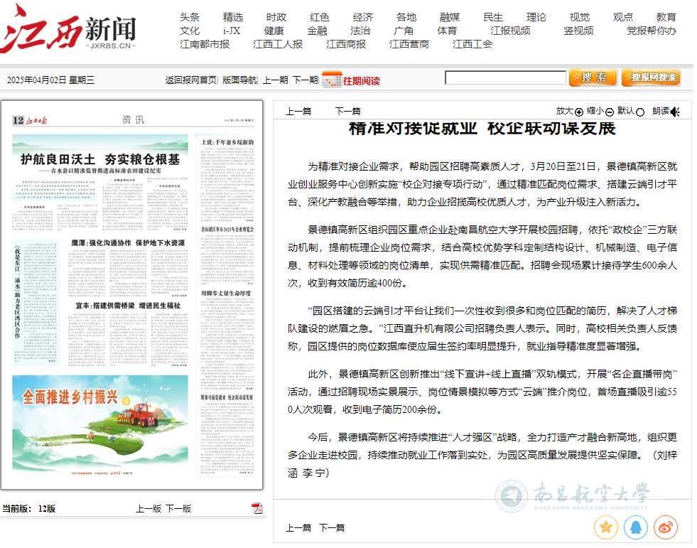 啟航網(wǎng)訊:近日,景德鎮(zhèn)高新區(qū)組織園區(qū)重點企業(yè)赴南昌航空大學開展校園招聘,江西日報12版對此進行報道。